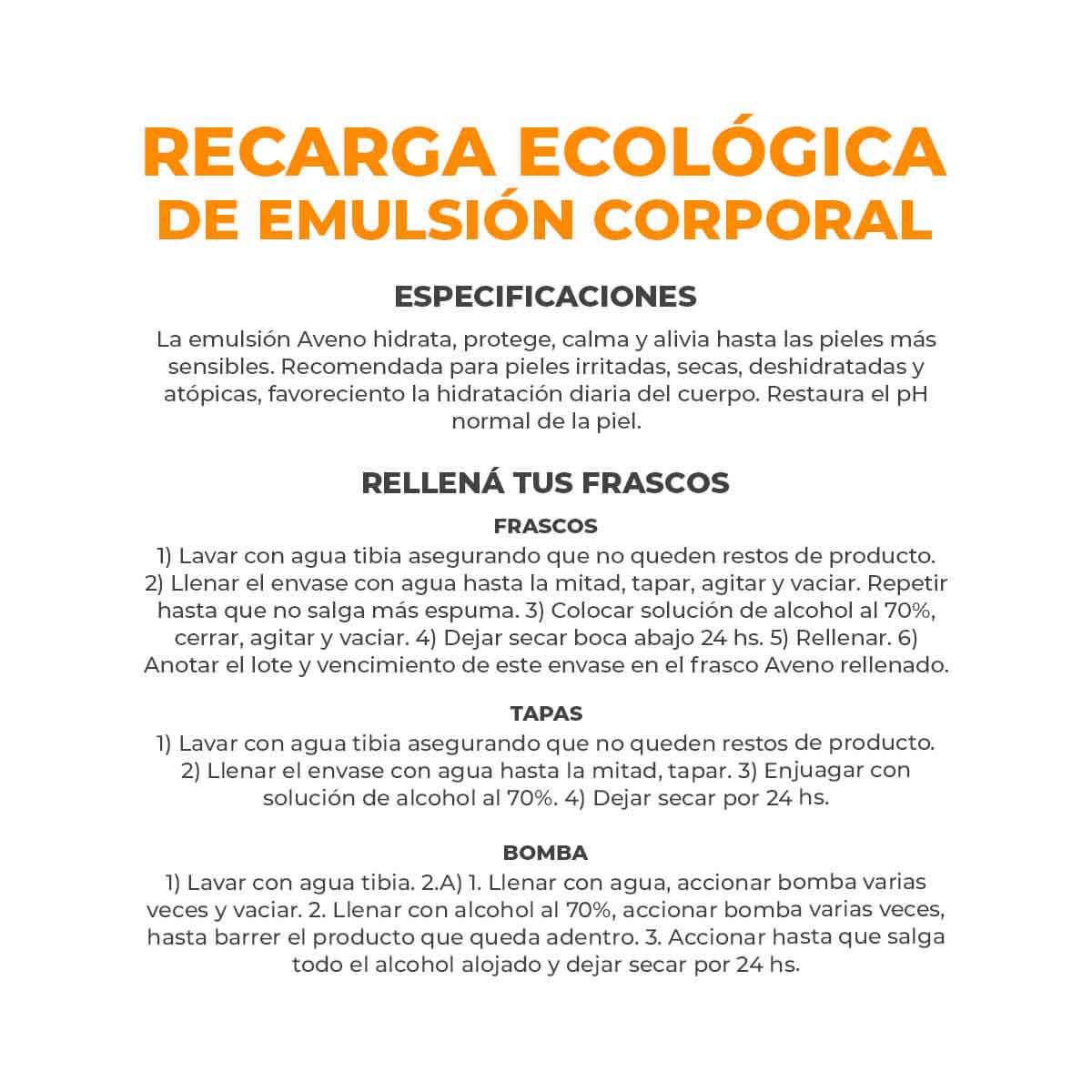 La emulsión Aveno hidrata, protege, calma y alivia las pieles sensibles. Recomendada para pieles irritadas, secas, deshidratadas y atópicas, favoreciendo la hidratación diaria del cuerpo. Restaura el pH normal de la piel. Debido a su composición a base de avena, ayuda a retener el agua evitando la deshidratación de la piel y manteniéndola protegida de las posibles agresiones externas. Es coadyuvante en casos de dermatitis, urticaria y erupción cutánea. Puede utilizarse sola o en combinación con otros tratamientos dermatológicos o cosméticos. Aplicar diariamente sobre la piel masajeando hasta su absorción. Realizar la cantidad de aplicaciones necesarias según el tipo y estado de la piel. Puede utilizarse sola o en combinación con otros tratamientos dermatológicos.