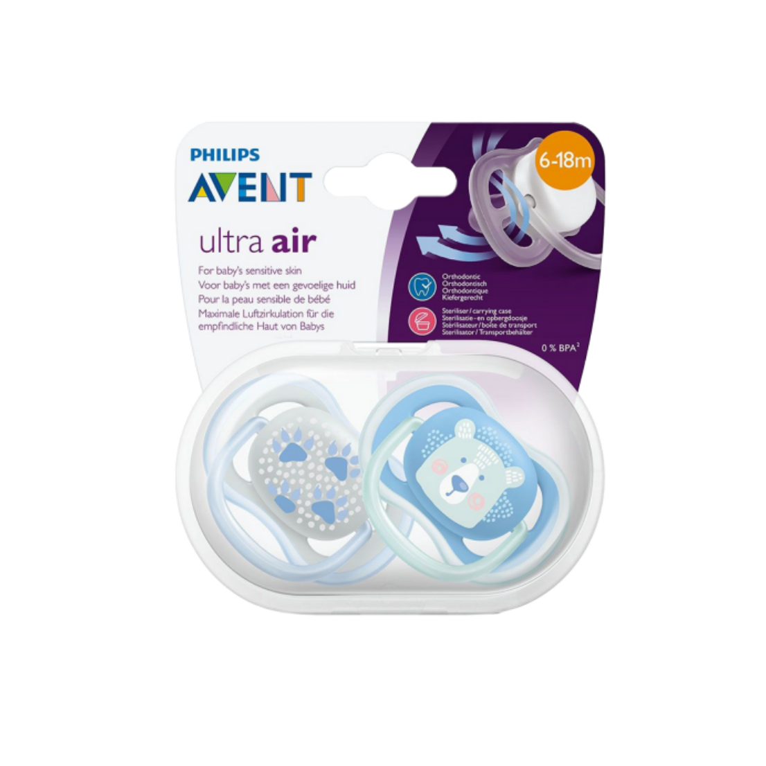 Tranquilidad con la comodidad del aire. El chupete ultra air de Philips Avent tiene orificios de aire extragrandes para mantener seca la piel de su bebé. Disponible en varios colores y diseños.