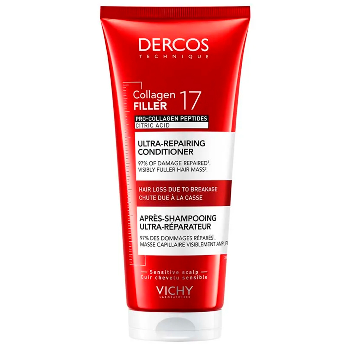 Vichy Dercos Acondicionador Ultra-Reparador Collagen 17 es un tratamiento acondicionador formulado para combatir la caída del cabello por rotura, fortaleciendo la fibra capilar desde el interior. Su tecnología avanzada ayuda a reparar hasta 17 signos de daño capilar, logrando un cabello visiblemente más resistente, suave y con mayor volumen. Está enriquecido con ácido cítrico y péptidos de colágeno biosintético, ingredientes clave que actúan sobre los enlaces debilitados de la fibra capilar.