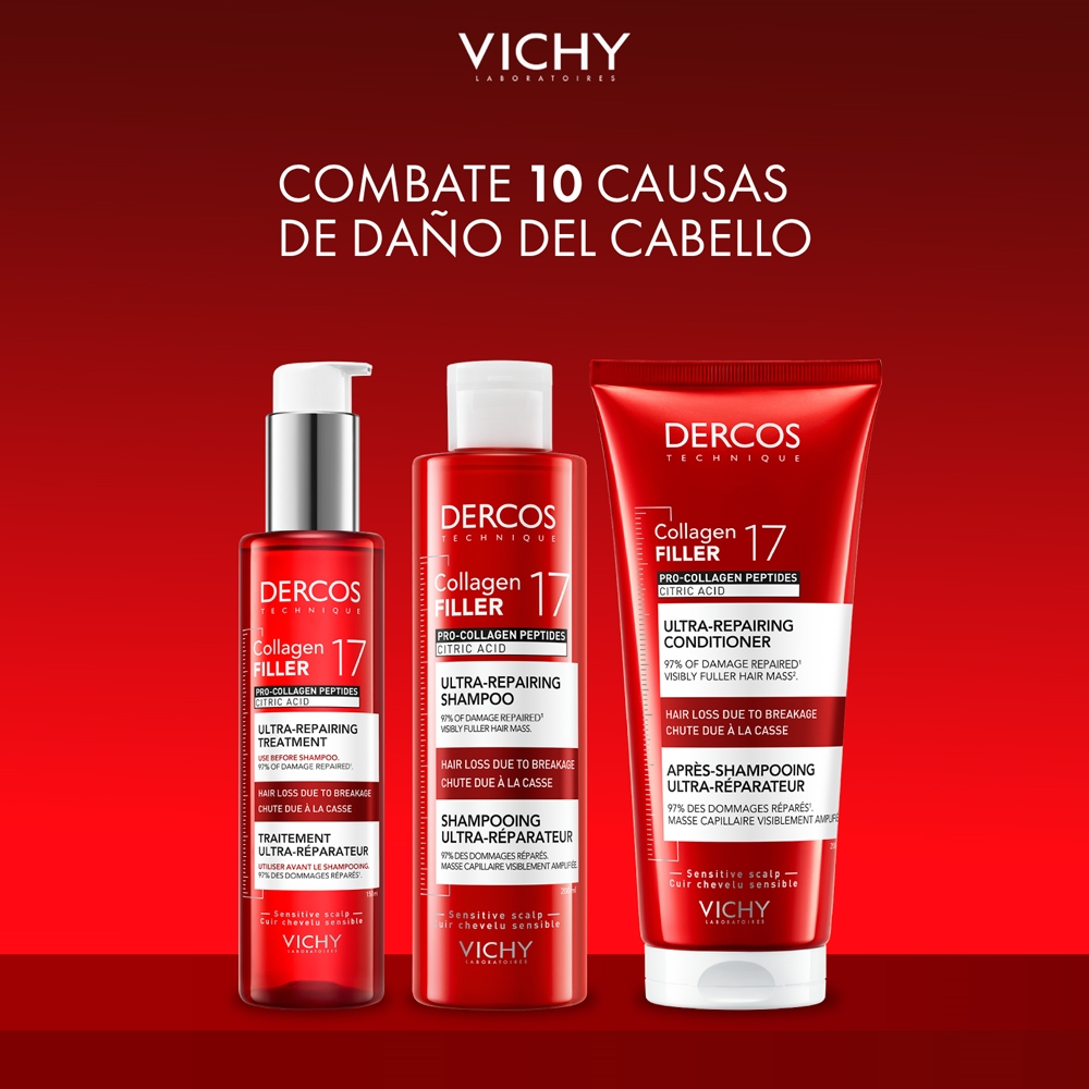 Vichy Dercos Pre-Shampoo Ultra-Reparador Collagen 17 es un tratamiento intensivo diseñado para fortalecer el cabello antes del lavado y combatir la caída por rotura desde la raíz. Su fórmula dermocosmética combina ácido cítrico, un AHA de alta penetración, y péptidos de colágeno biosintético que ayudan a recrear los enlaces debilitados de la fibra capilar. Actúa como el primer paso de la rutina Collagen 17, preparando el cabello y el cuero cabelludo para una reparación profunda y visible.