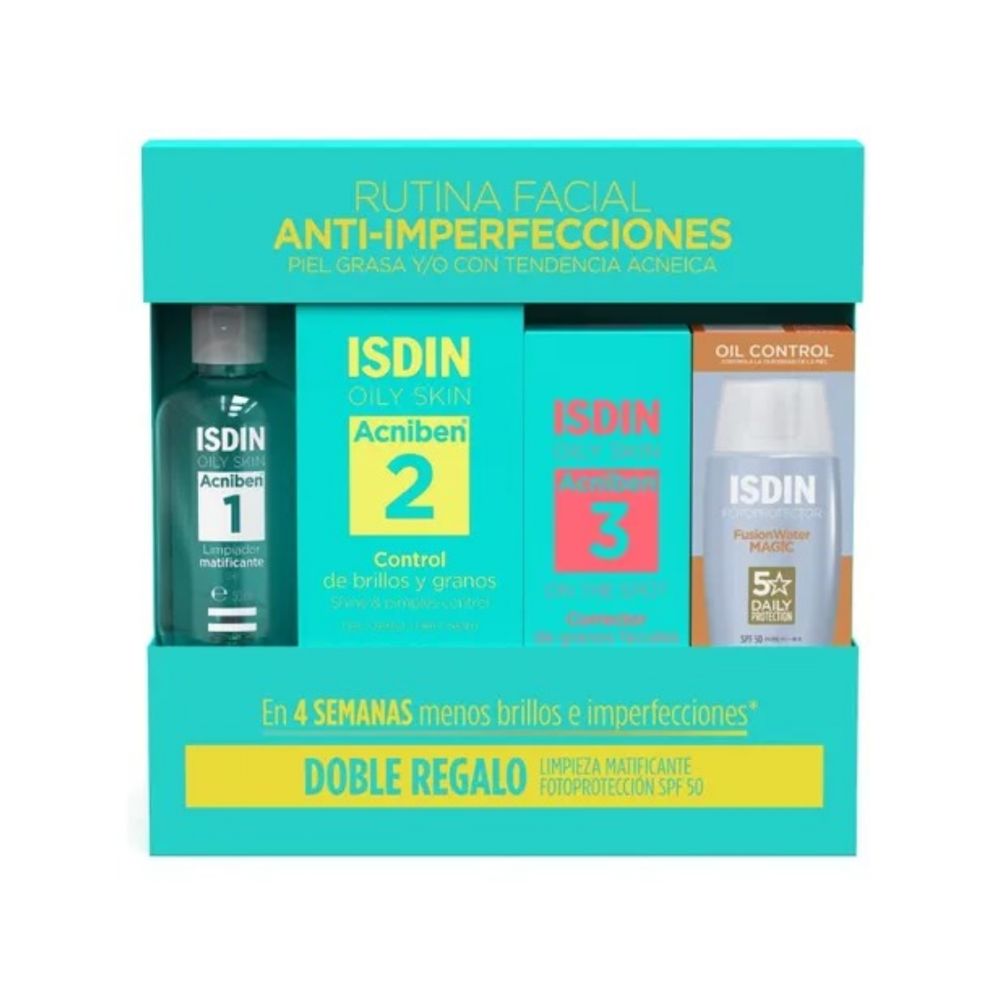 El Combo de Piel Grasa de ISDIN incluye el Gel Limpiador Matificante de 50 ml + Paso 2 Gel Contorno de Brillo y Granos de 40 ml + Paso 3 On the Spot Corrector de granos Faciales 15ml + Protector Solar Fusion Water MAGIC SPF 50 de 50 ml
