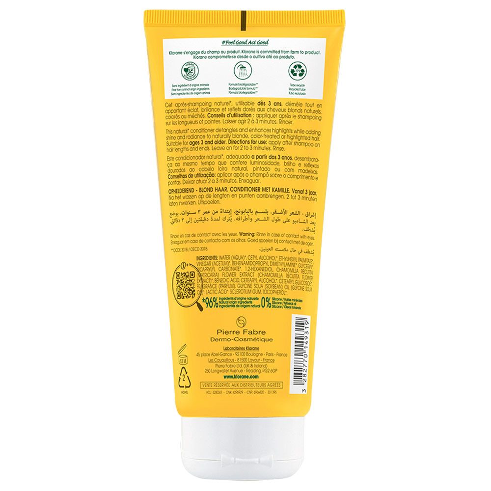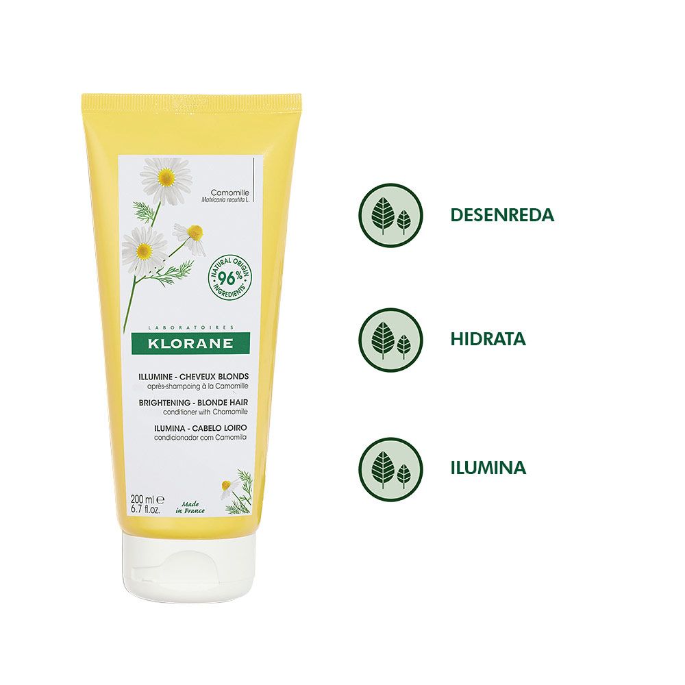 Ideal para el cabello rubio, seco y dañado, la crema acondicionadora a la Camomila, iluminadora y reparadora, desenreda y nutre sin apelmazar el cabello. Su textura rica en agentes reparadores, untuosa, nacarada y delicadamente perfumada, repara el cabello en profundidad, devolviéndole suavidad y flexibilidad. Reparado, el cabello queda flexible y suave al tacto: Resplandeciente de luminosidad.